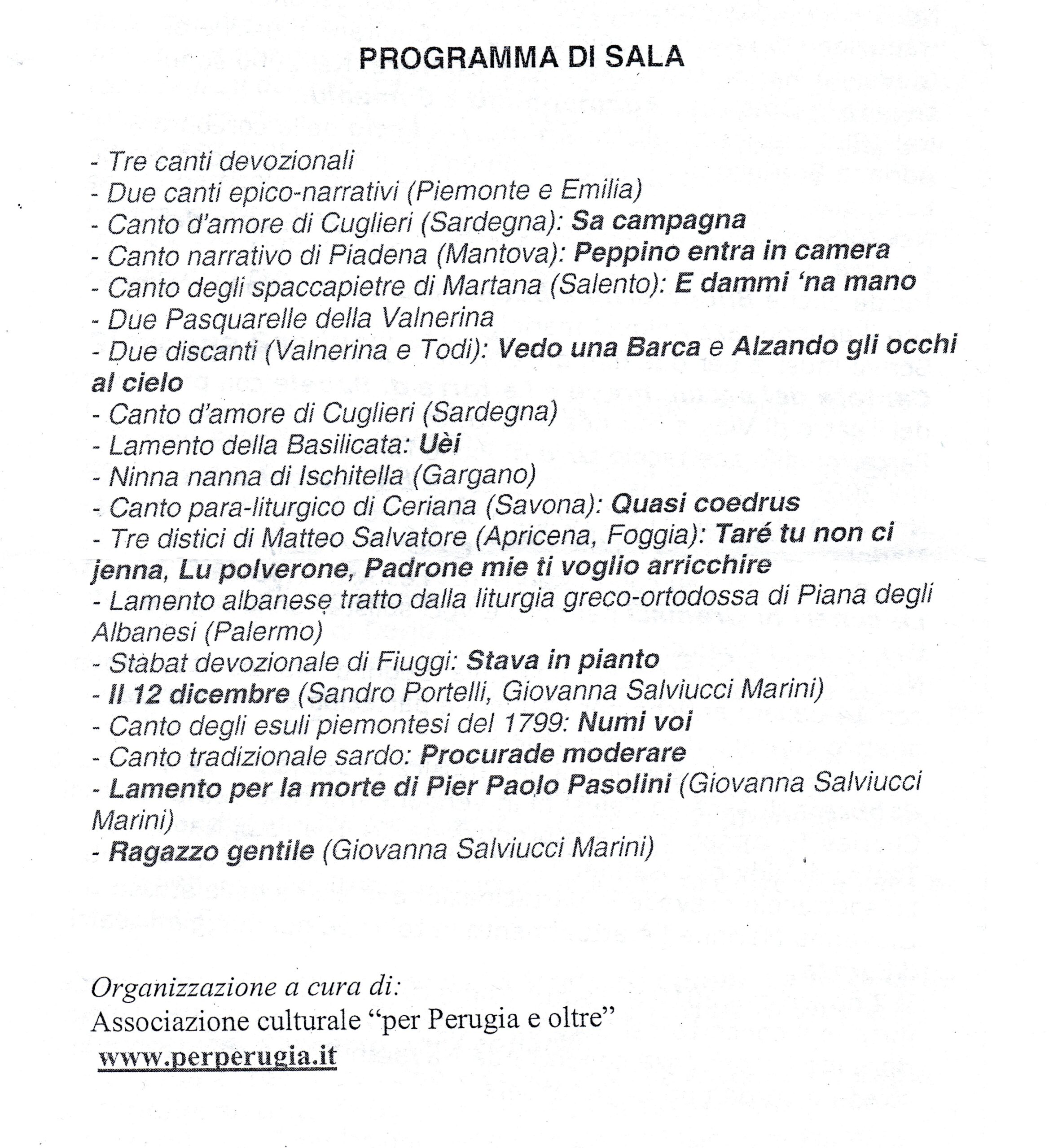 Frutto di una accurata ricerca musicale, i vari canti, lamenti, ninne-nanne ci hanno fatto viaggiare virtualmente per tutta l’Italia, riscoprendo le tradizioni, storie e modi di cantare tramandati da una cultura orale fiorente sino al dopo guerra e che rivive grazie al tenace, accurato lavoro di chi come Giovanna Marini vi si dedica con passione e tenacia.