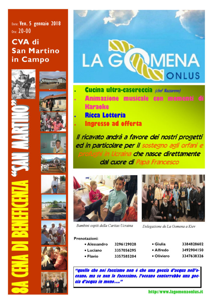 La consueta cena di solidarietà d’Epifania avrà luogo venerdì 5 gennaio 2018 alle ore 20,00, presso il CVA di San Martino in Campo.
