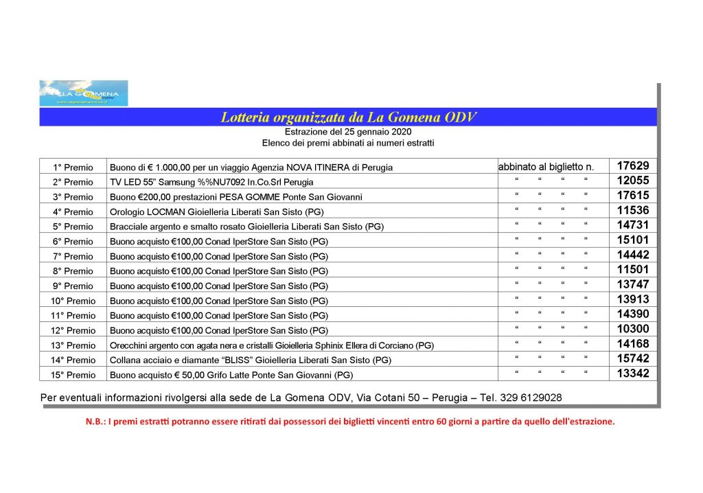 Home » Lotteria La Gomena ODV – estrazione 25 gennaio 2020