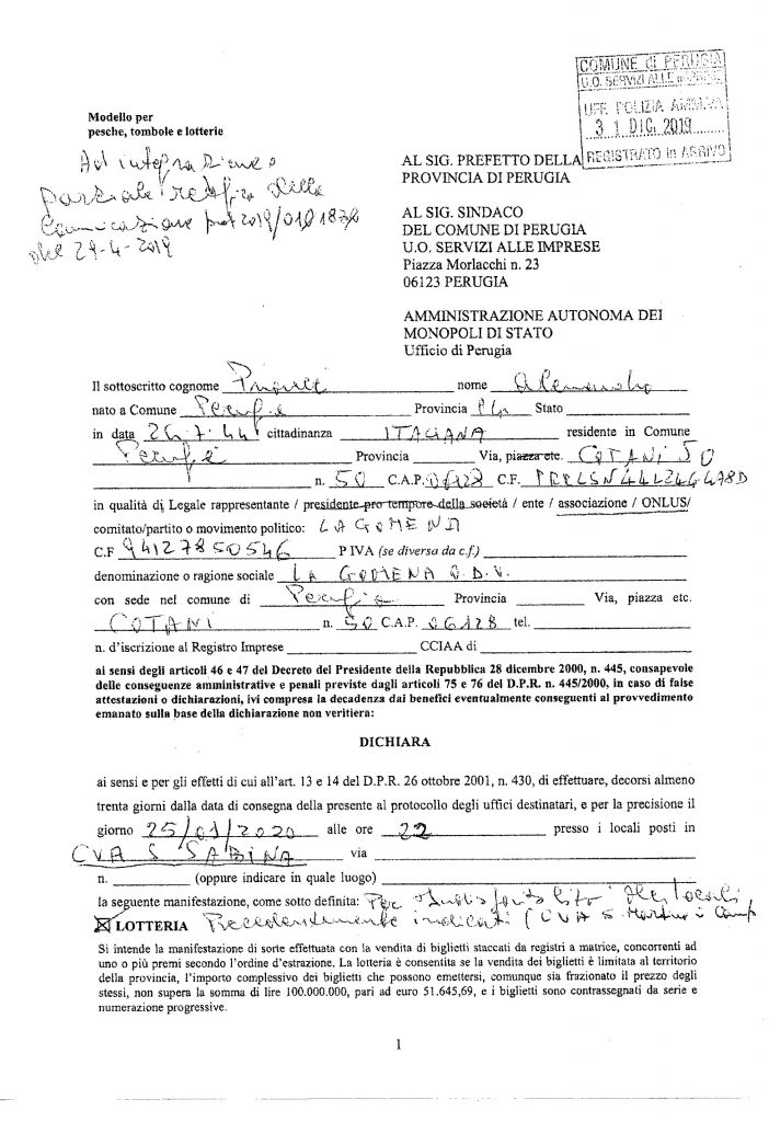 Si comunica che a seguito della inagibilità del CVA di San Martino in Campo, l’estrazione della lotteria verrà fatta in occasione della Cena di Solidarietà presso il CVA di Santa Sabina (“La Coccinella”) sabato 25 gennaio 2020, alle ore 22,00 circa, come comunicato alle autorità competenti.